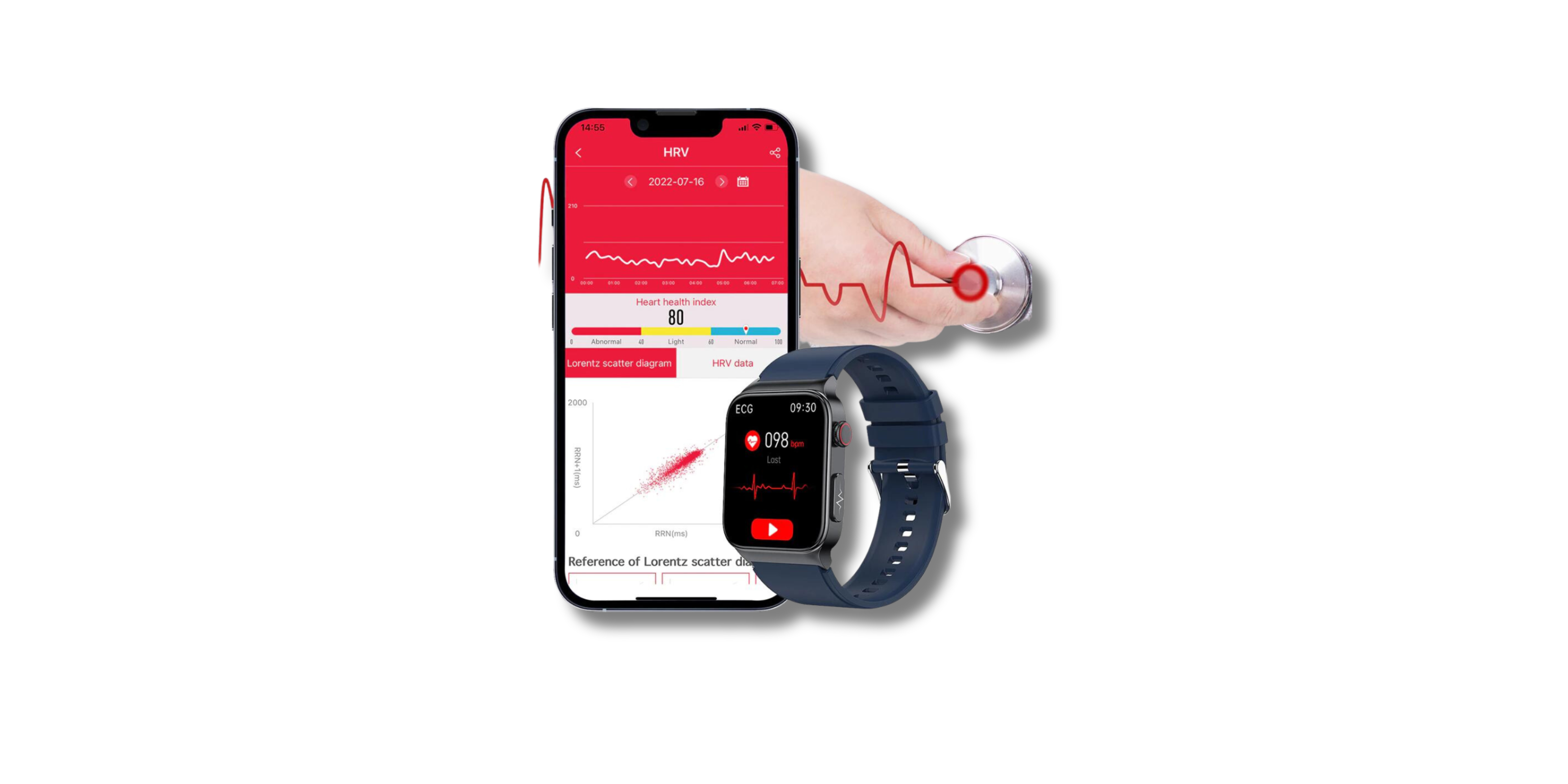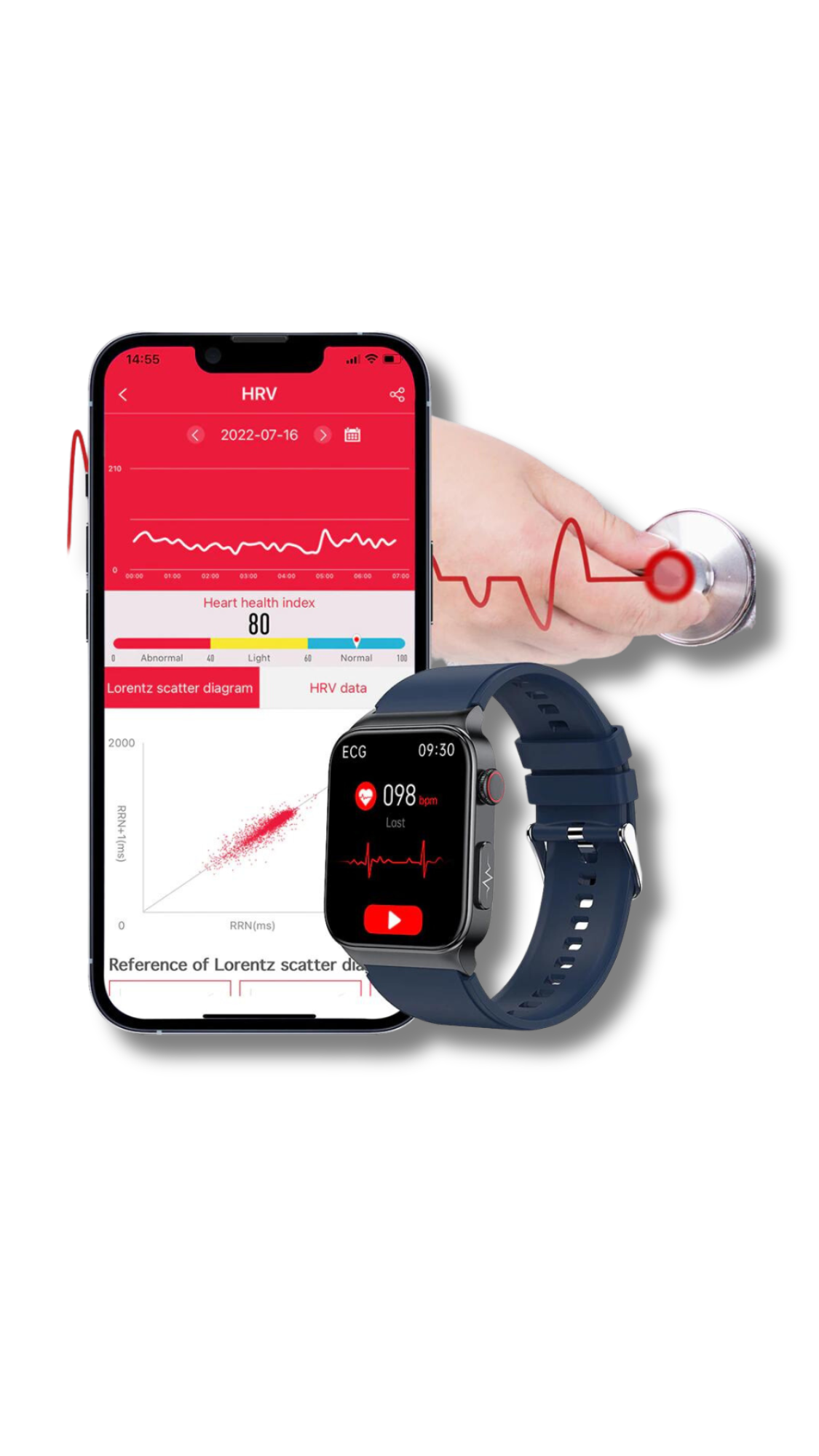 There is an HRV heart health index analysis and a Lorentz scatter plot in the mobile app. With the analysis report, you can intuitively observe the patterns of heart beating and make objective judgments about cardiac arrhythmias.